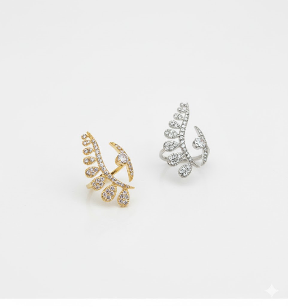 Découvrez notre BAGUE – AMÉLIA, au design raffiné et audacieux, évoquant la délicatesse d’une plume ou d’une aile ornée. Son anneau ouvert entoure élégamment le doigt, créant un effet aérien et léger. Chaque courbe est sertie de strass scintillants, dont certains en forme de gouttes, qui captent la lumière à chaque mouvement. Disponible en deux finitions : une version dorée pour un éclat chaleureux et sophistiqué, et une version argentée pour une allure intemporelle et lumineuse. Parfaite pour sublimer vos tenues avec grâce et originalité, cette bague allie féminité et modernité.