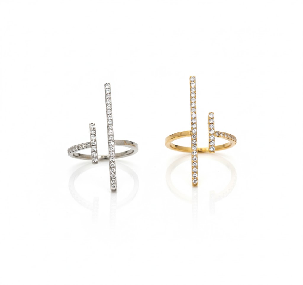 Découvrez notre BAGUE – AVELINE, au design contemporain et élégant, composée de deux barres de tailles différentes, chacune ornée de strass scintillants. La barre la plus grande, placée de manière perpandiculaire, se distingue par son éclat impressionnant, tandis que la barre plus petite complète harmonieusement l’ensemble avec une touche plus subtile. Ces strass apportent une brillance délicate à chaque mouvement, créant un jeu de lumière raffiné. Ce bijou moderne et minimaliste est parfait pour ajouter une note chic et originale à vos tenues, tout en offrant une belle résistance grâce à son matériau en acier inoxydable. Un choix idéal pour celles et ceux qui apprécient les designs épurés avec une touche de glamour.