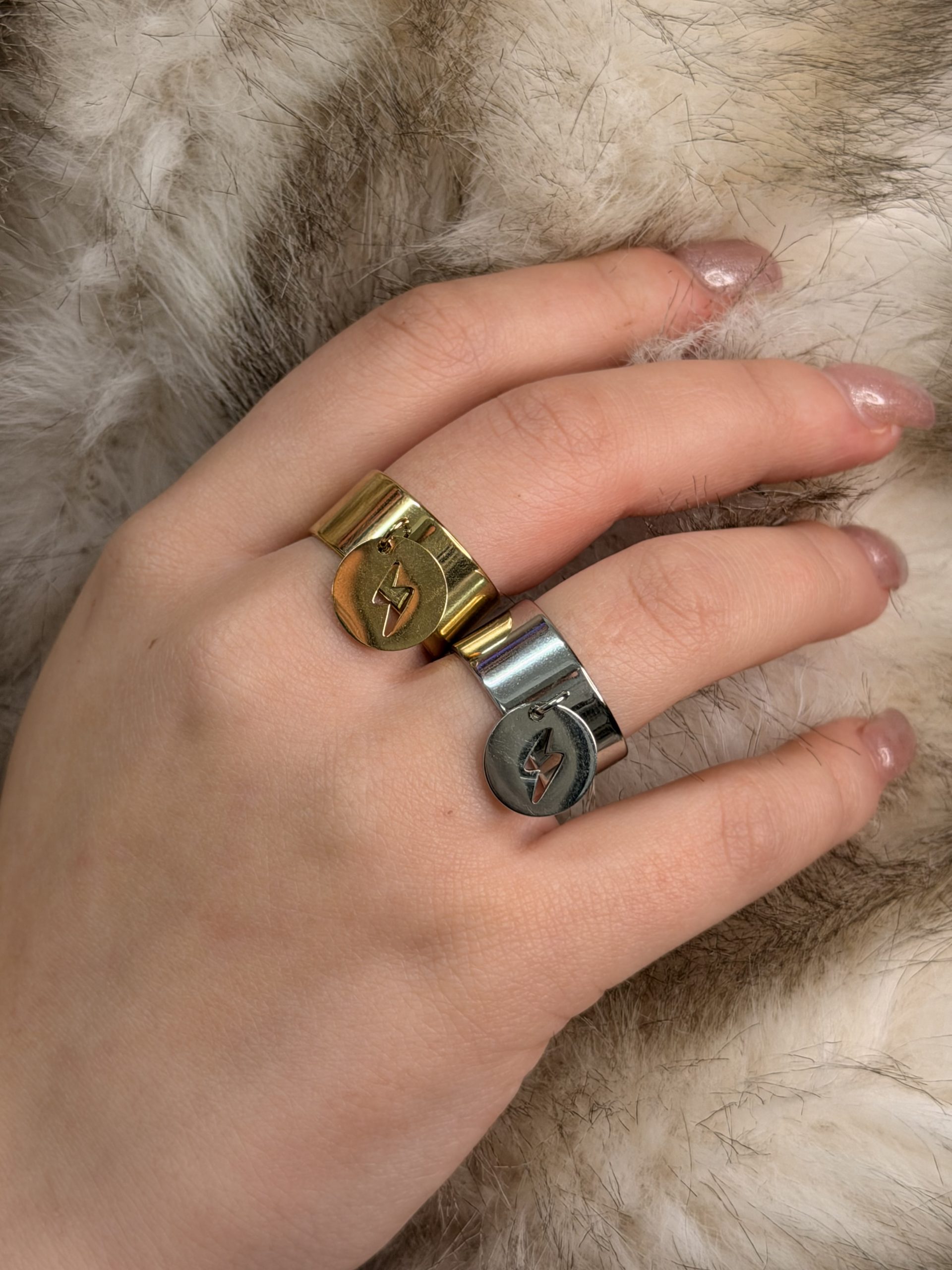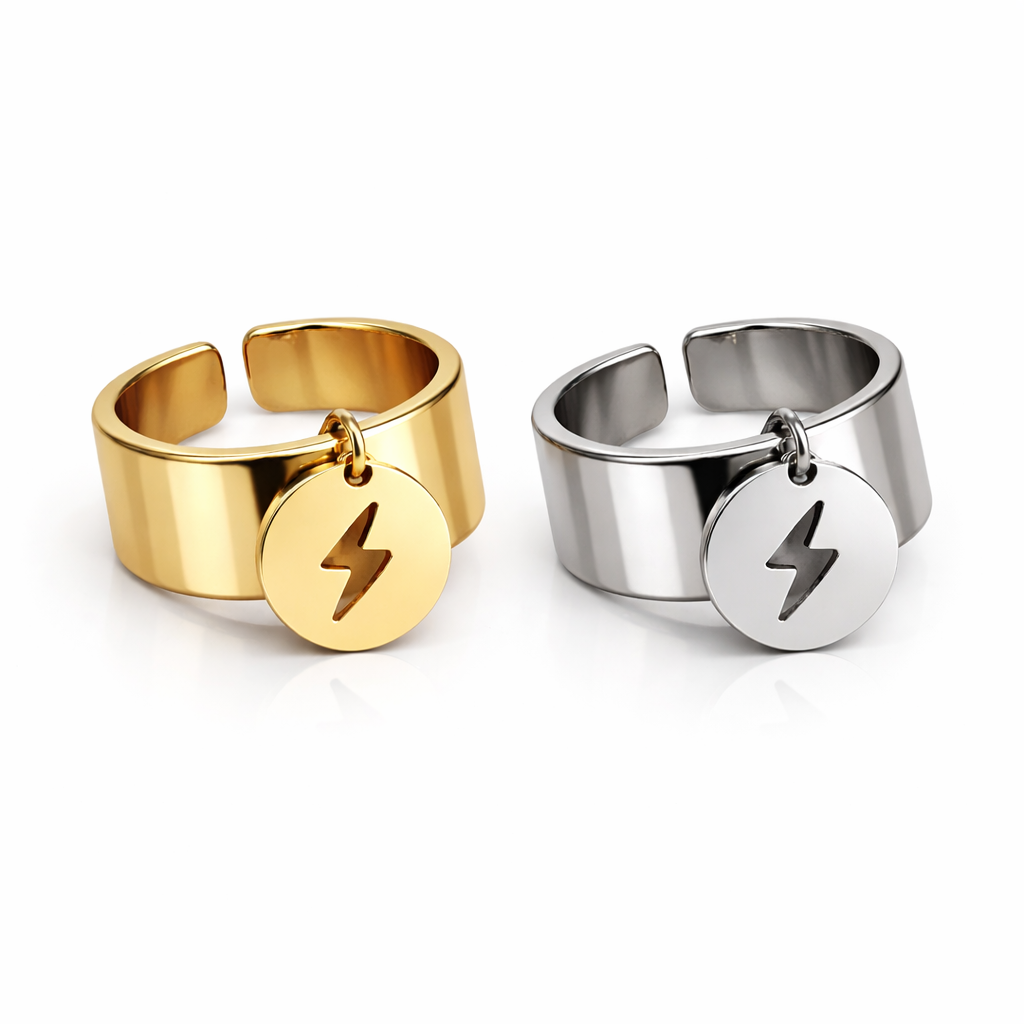 Découvrez notre BAGUE – ÉNERGIE, une pièce audacieuse et tendance pensée pour celles et ceux qui aiment les bijoux qui ne passent pas inaperçus. Disponible en finition dorée ou argentée, elle séduit par son anneau large en acier inoxydable et son pendentif rond orné d’un éclair, symbole de puissance et de dynamisme. Ce détail apporte une touche rock et moderne qui dynamise n’importe quel look. Que tu choisisses la version dorée chic ou l’argentée plus urbaine, cette bague deviendra vite un incontournable de ta collection. Elle se porte aussi bien seule pour un effet statement qu’associée à d’autres bagues pour un style plus affirmé. Résistante à l’eau et à la vie, elle t’accompagne au quotidien sans jamais ternir. Ose l’intensité de l’éclair !