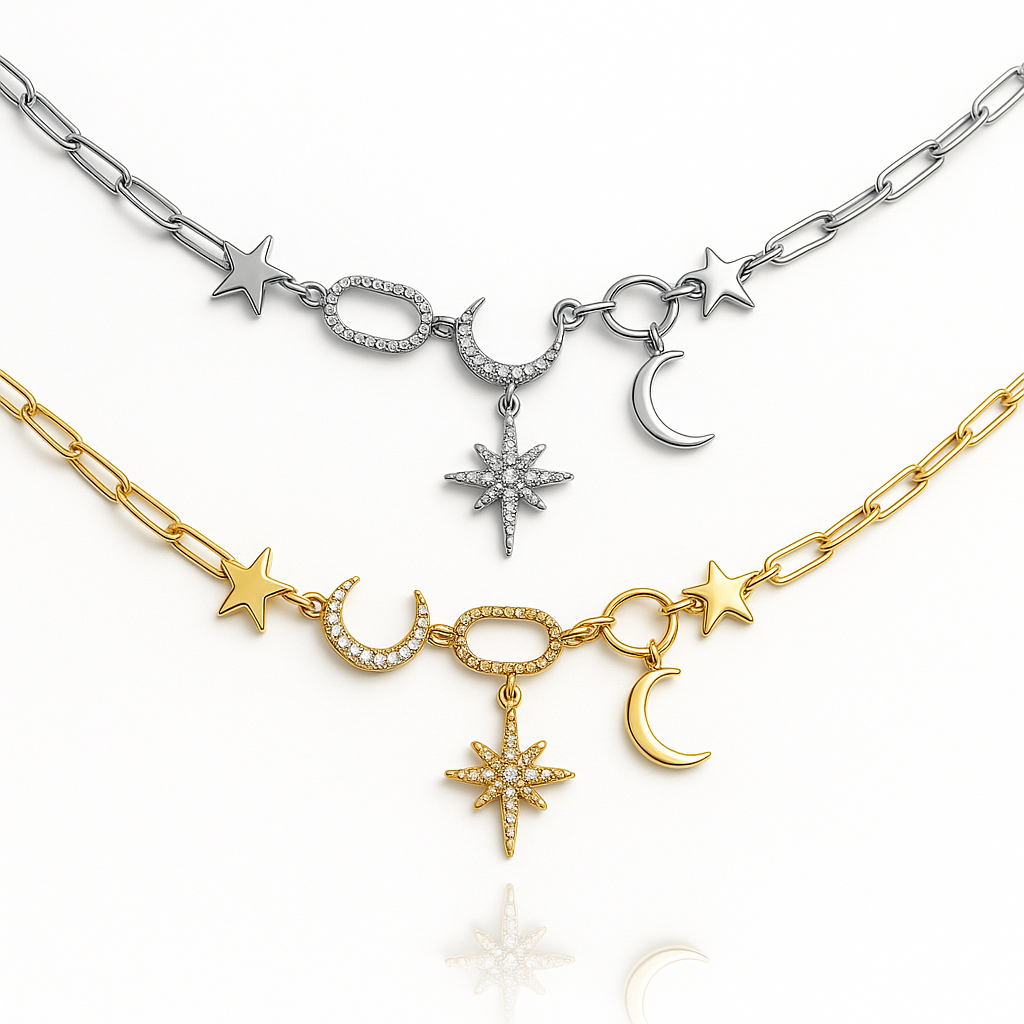 Découvrez notre COLLIER – ISIL, une création céleste en acier inoxydable, orné de pampilles représentant la lune, les étoiles et un soleil scintillant. Disponible en doré ou argenté, il apporte une touche de lumière et de magie à votre style. Son design original et raffiné en fait un bijou unique, parfait pour illuminer vos tenues du quotidien ou vos looks de soirée.