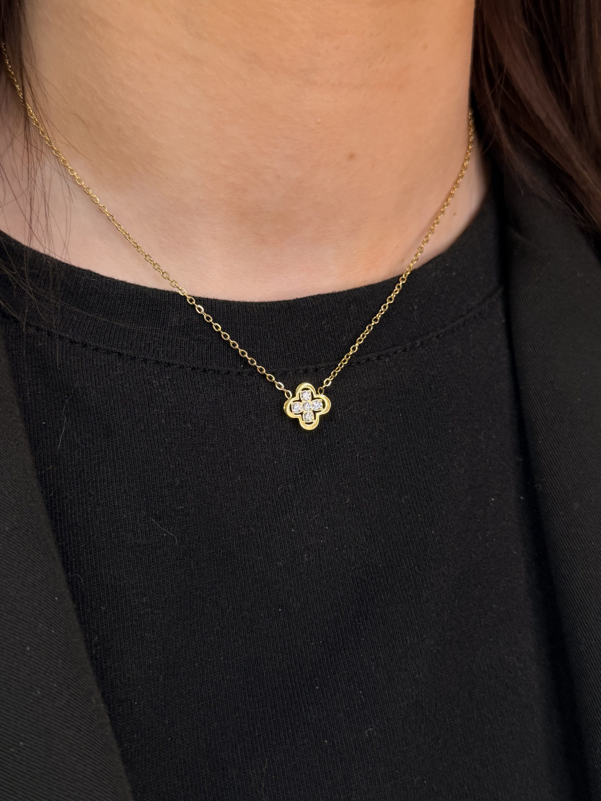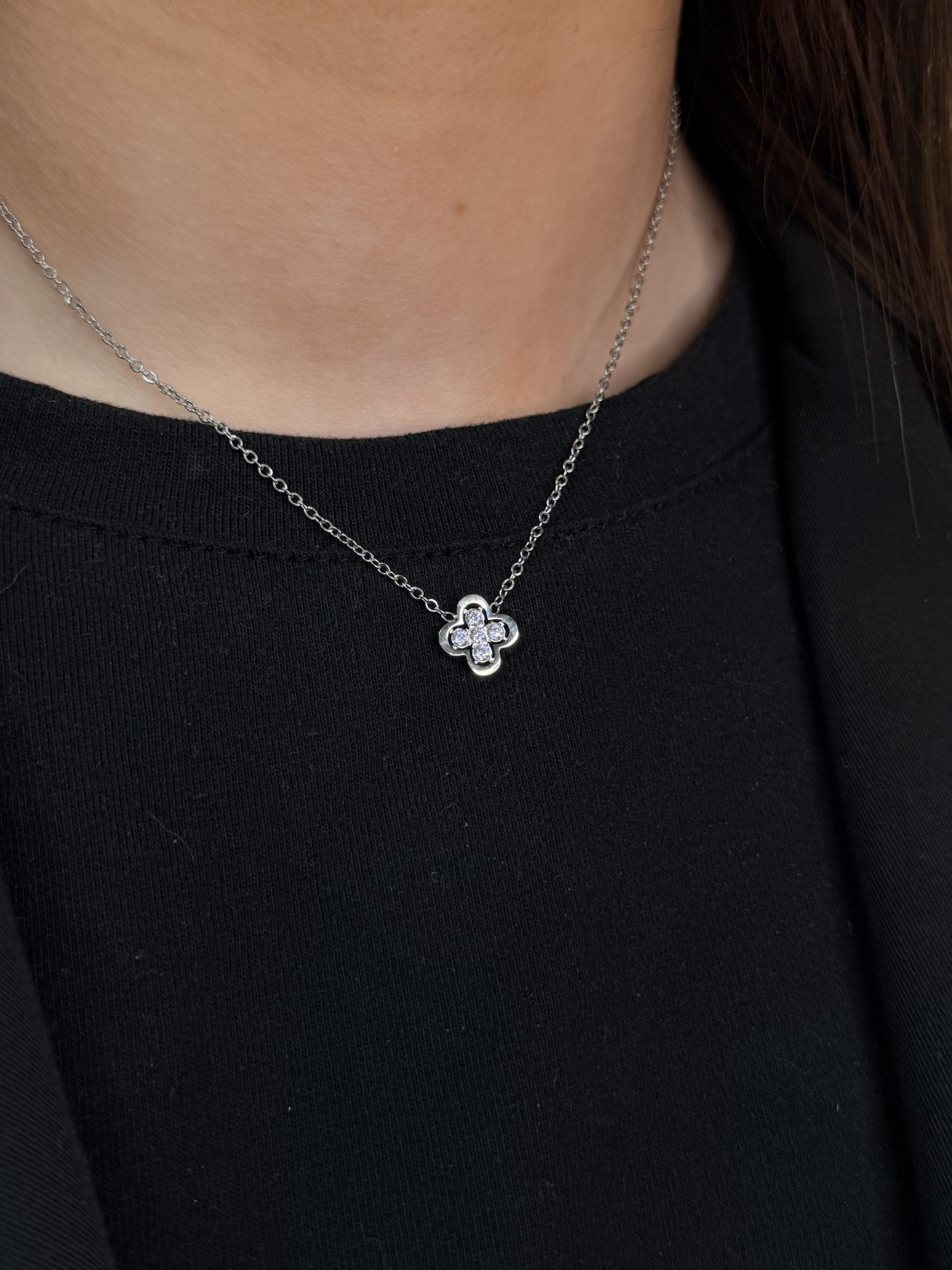 Découvrez notre COLLIER – KELIO, confectionné en acier inoxydable pour garantir éclat et durabilité au quotidien. Son pendentif délicat en forme de trèfle, orné de zircons scintillants, symbolise élégance et chance. Disponible en doré ou argenté, il apporte une touche raffinée et intemporelle à toutes vos tenues.