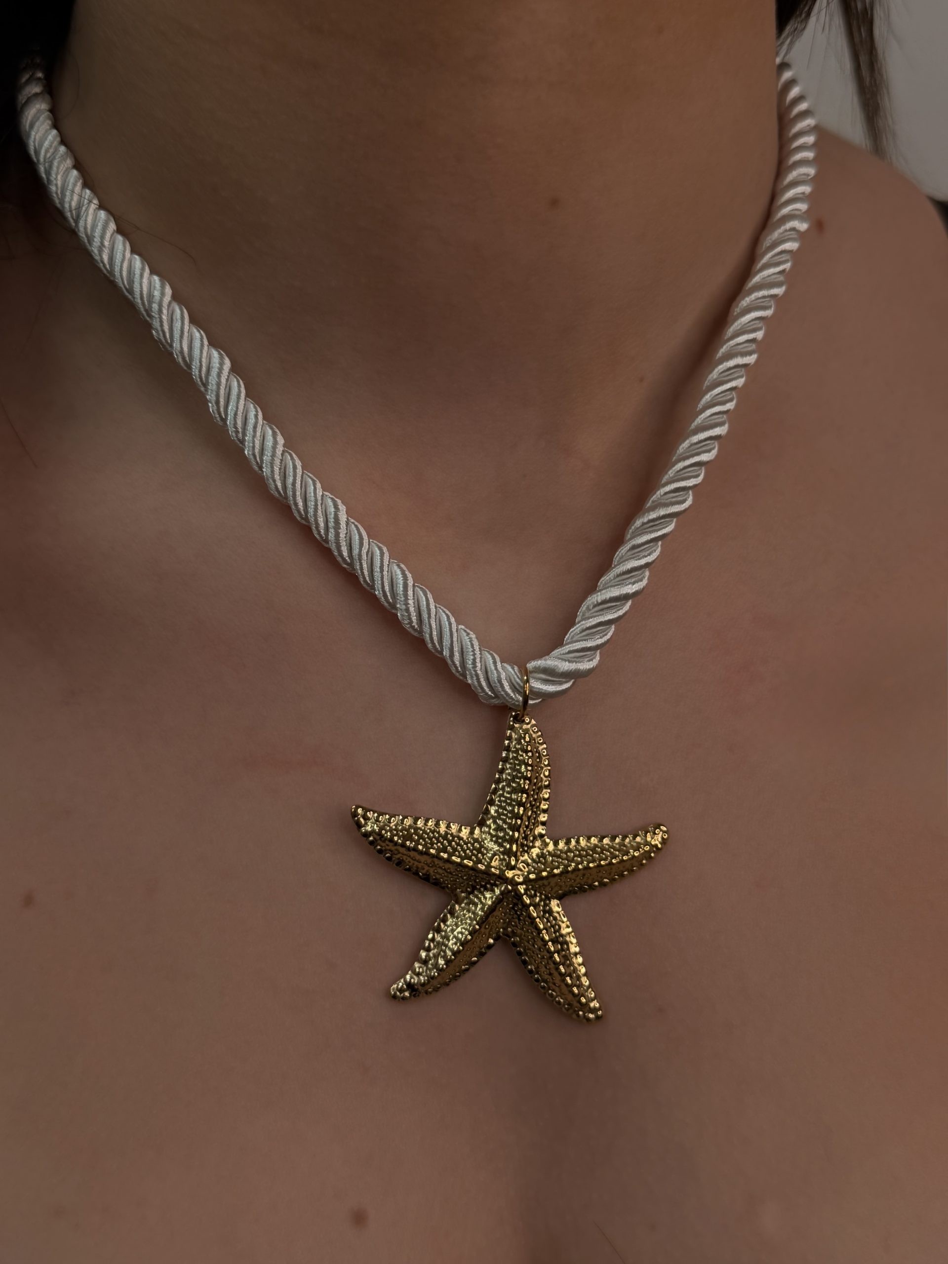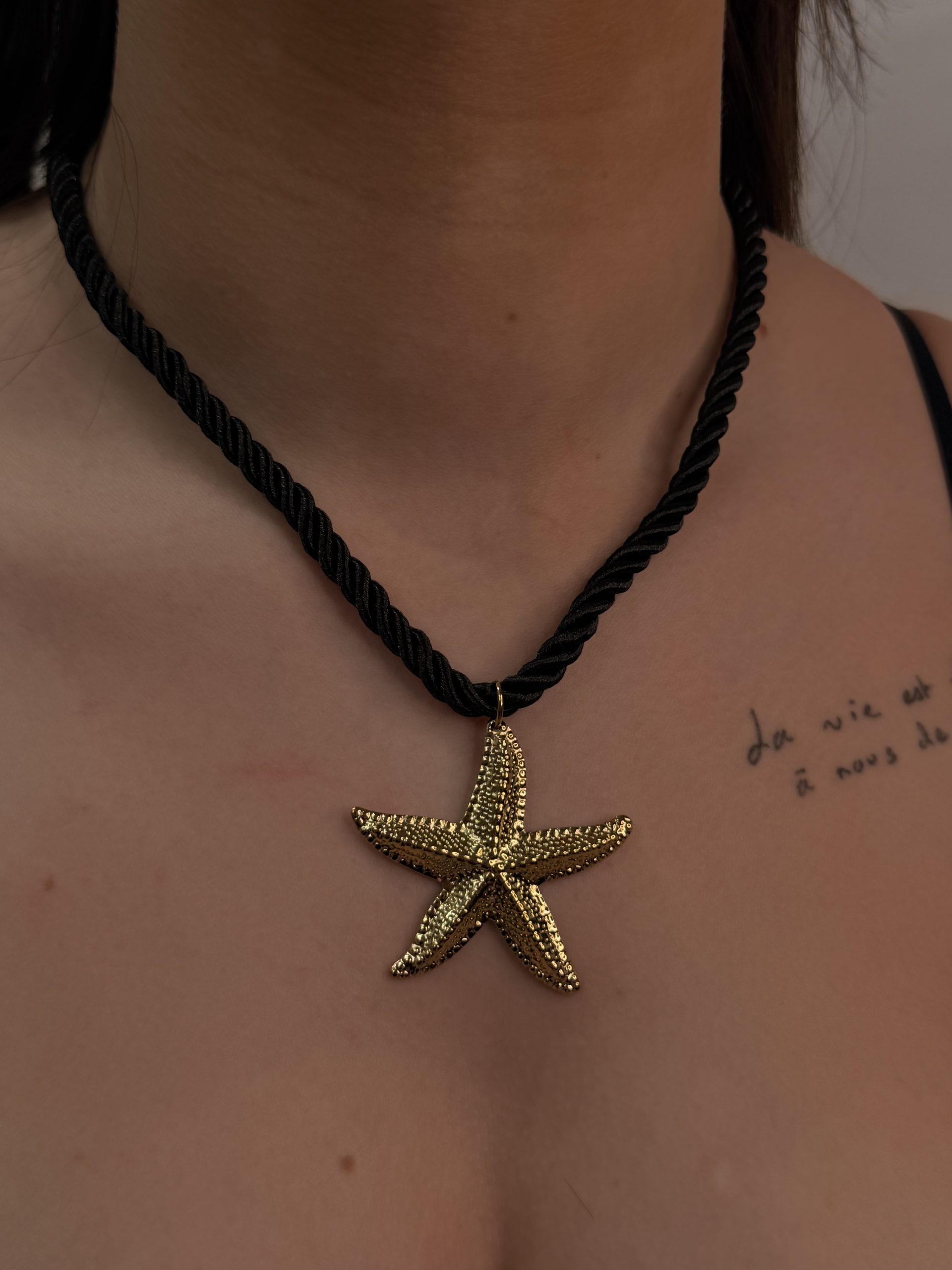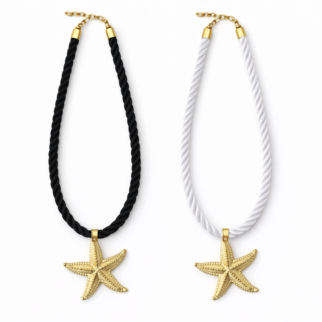 Découvrez notre COLLIER – SORAYA, une pièce originale qui marie élégance et esprit marin. Conçu en acier inoxydable, il se distingue par son pendentif étoile de mer dorée, suspendu à un cordon épais torsadé, disponible en noir ou en blanc. Audacieux et tendance, ce bijou apporte une touche estivale et raffinée à vos looks.