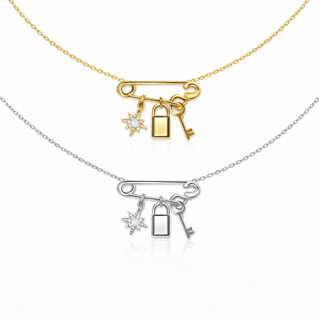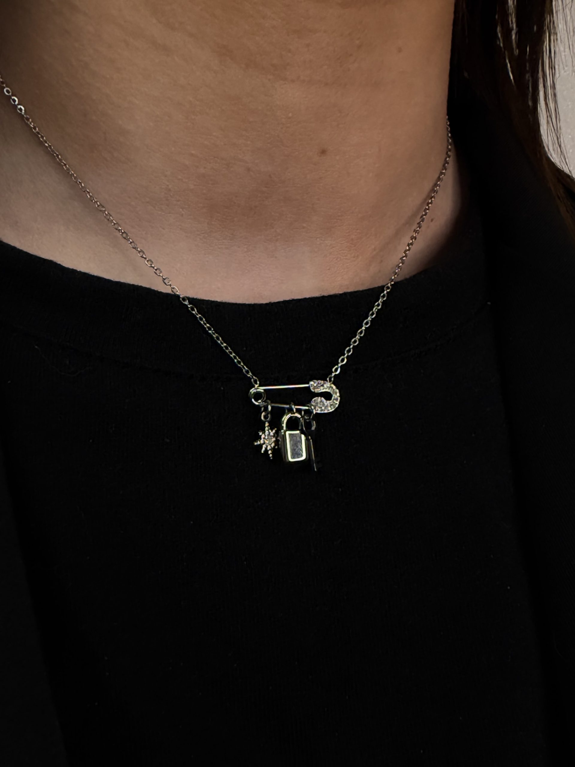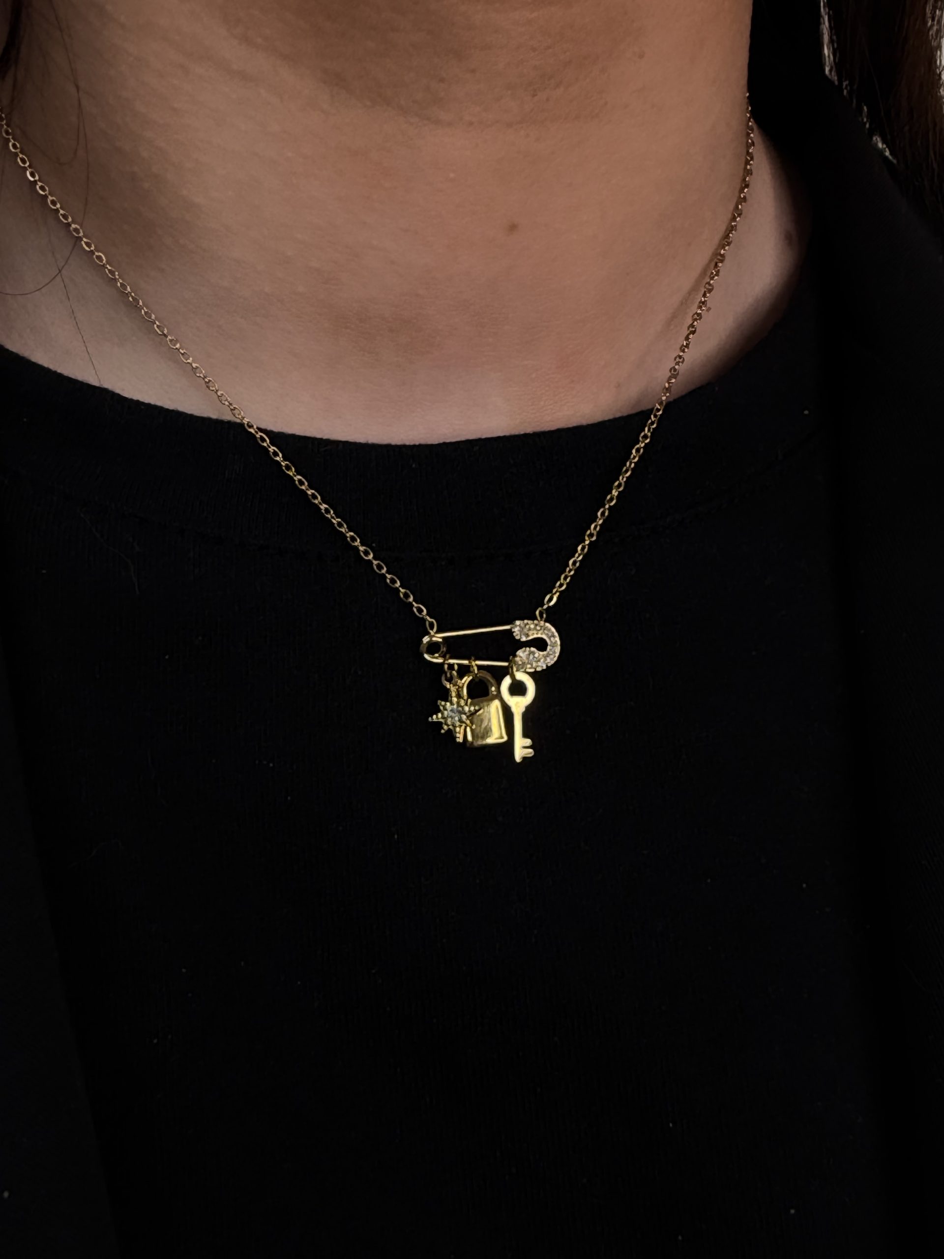 Découvrez notre COLLIER – SPILLO, réalisé en acier inoxydable pour une brillance durable et une solidité à toute épreuve. Son pendentif en forme d’épingle à nourrice, orné de charms symboliques tels qu’une clé, un cadenas et une étoile scintillante, en fait un bijou original et tendance. Disponible en doré ou argenté, il se porte comme une véritable pièce statement qui attire tous les regards.