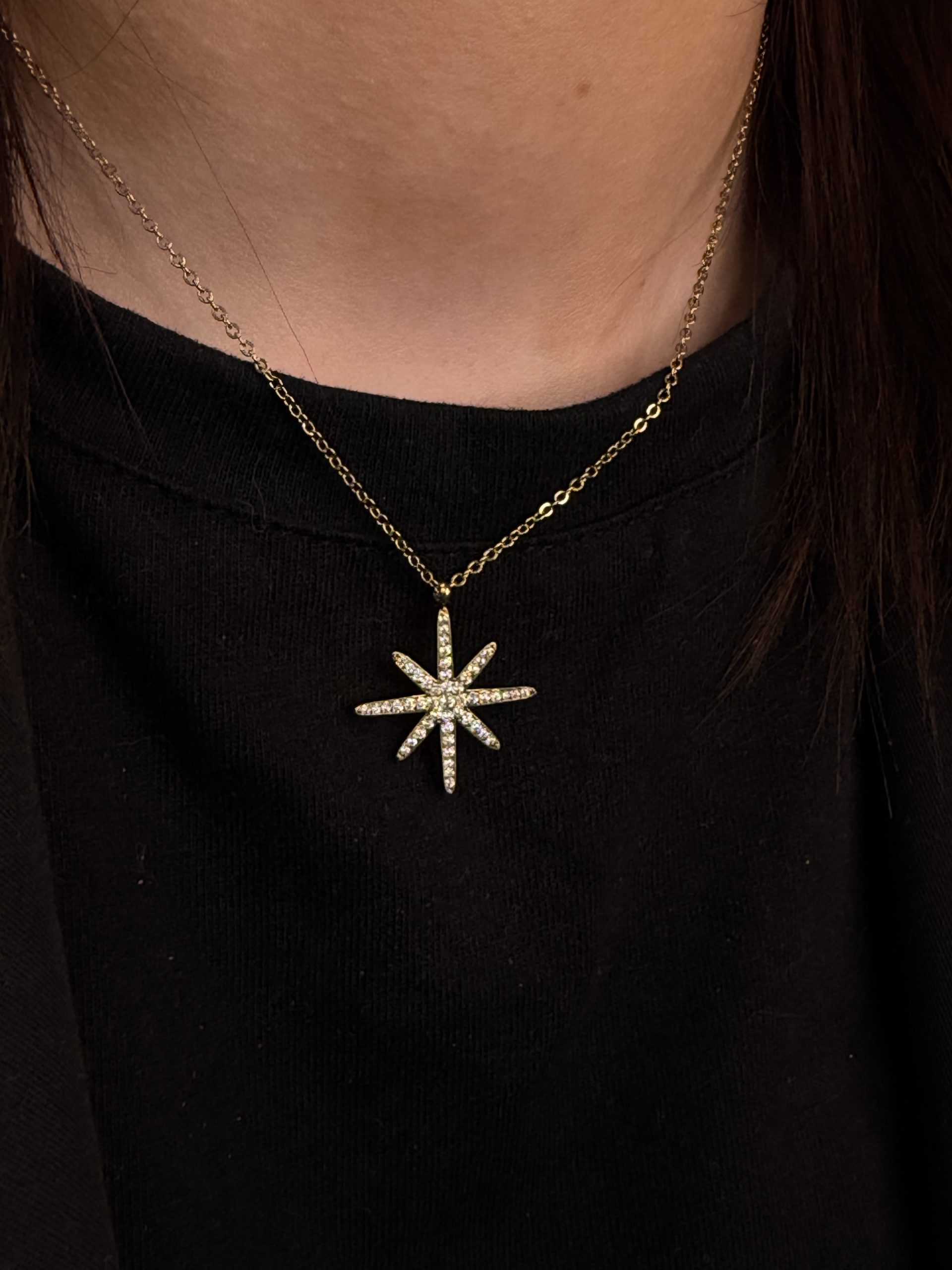Découvrez notre COLLIER – STAR, réalisé en acier inoxydable, une matière qui allie élégance et durabilité. Son pendentif en forme d’étoile scintillante, entièrement orné de zircons étincelants, capte la lumière pour illuminer votre style. Disponible en doré, ce bijou raffiné est l’accessoire parfait pour apporter une touche céleste et glamour à vos tenues.